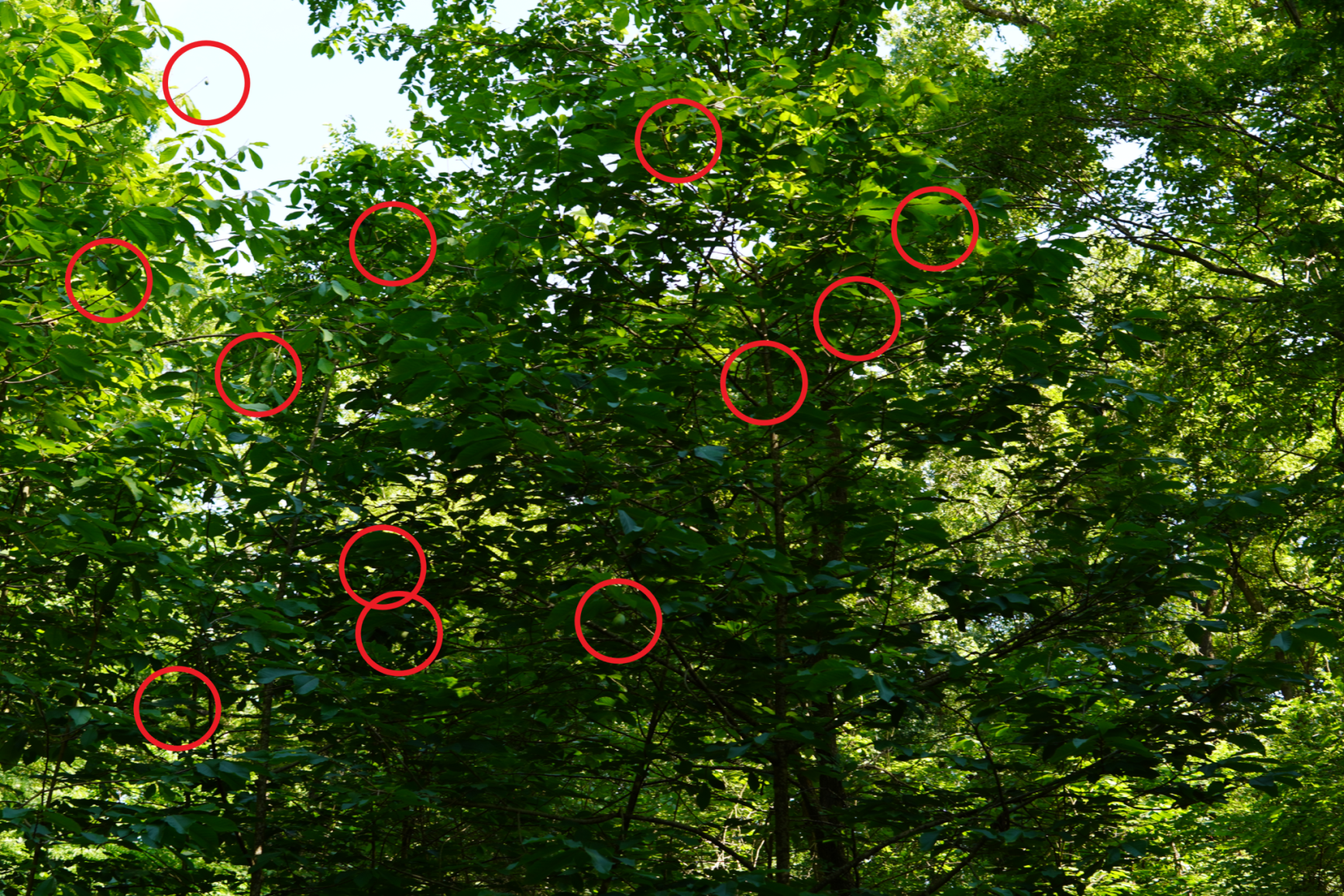 Thinning has led to markedly higher pawpaw production than would be expected under closed-canopy conditions (fruit clusters circled in red).