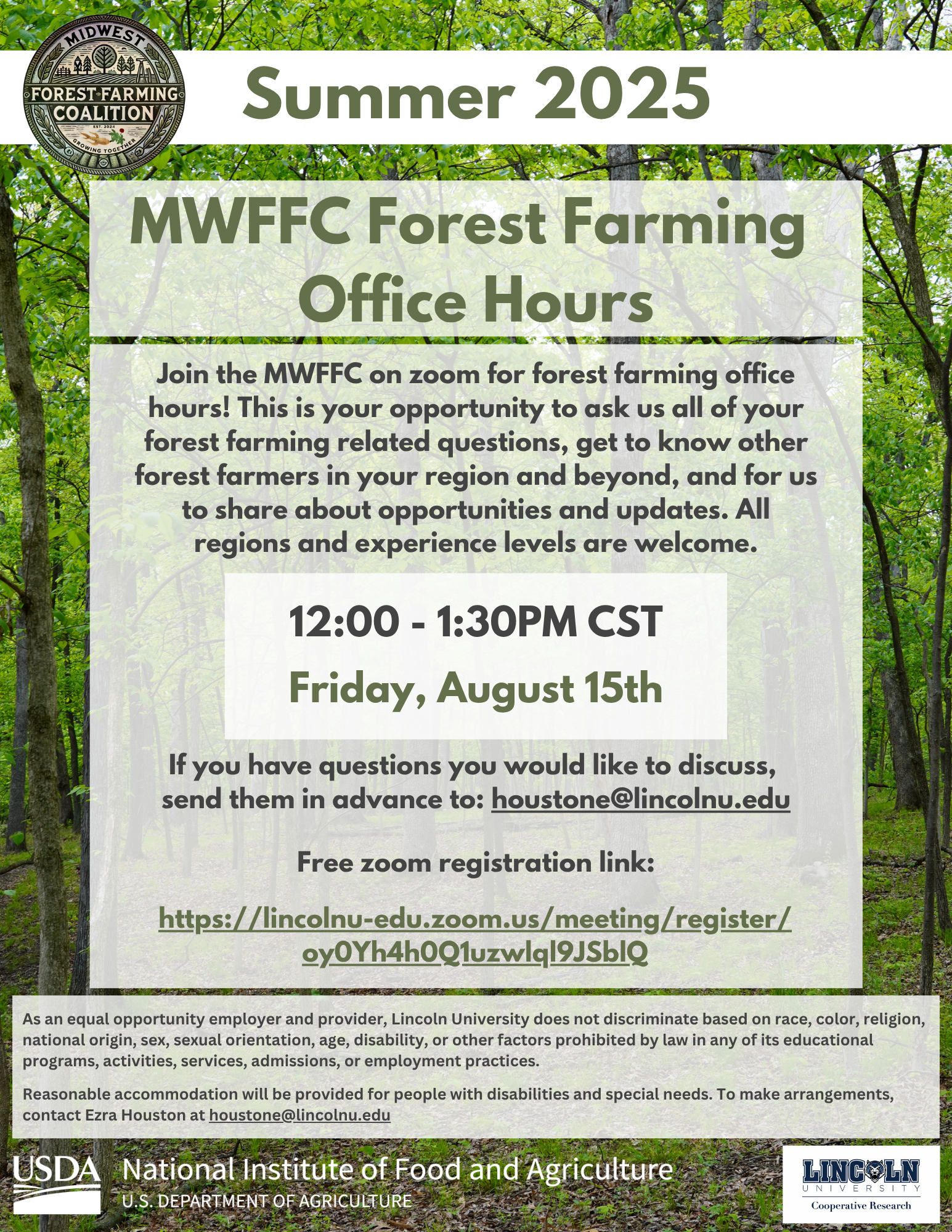over the lunch hour on Friday, August 15th for our monthly forest farming office hours, where we will talk about forest farming, answer questions, and connect with farmers in the region and beyond. This is a great opportunity to learn and expand your network.