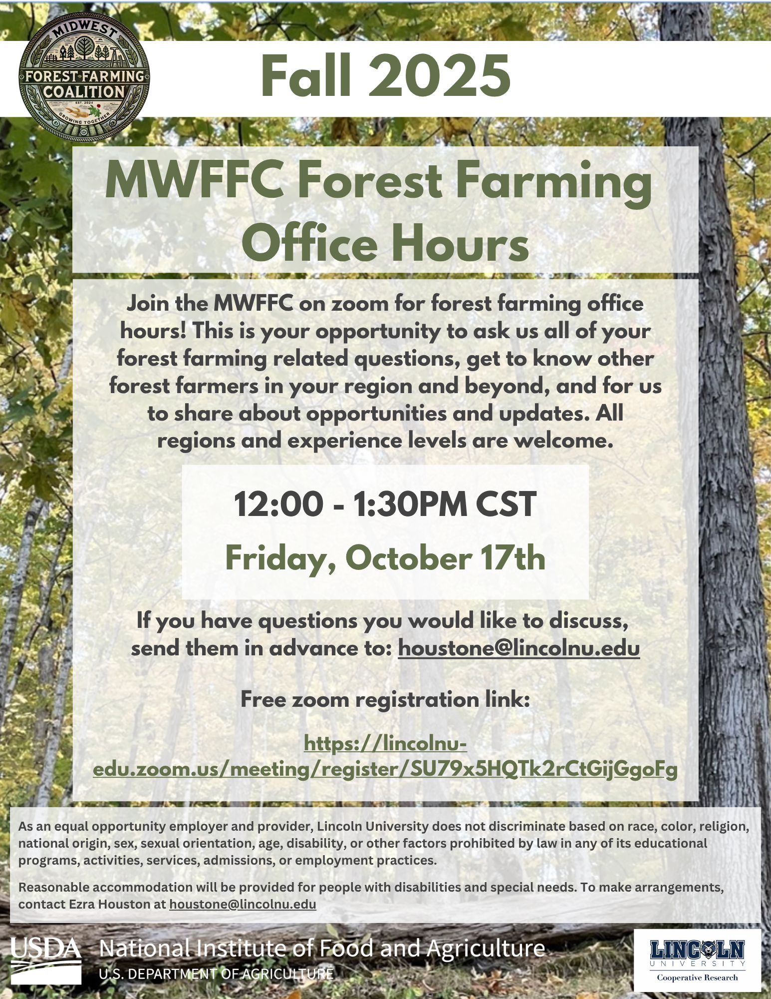 over the lunch hour on Friday, October 17th for our monthly forest farming office hours, where we will talk about forest farming, answer questions, and connect with farmers in the region and beyond. This is a great opportunity to learn and expand your network.